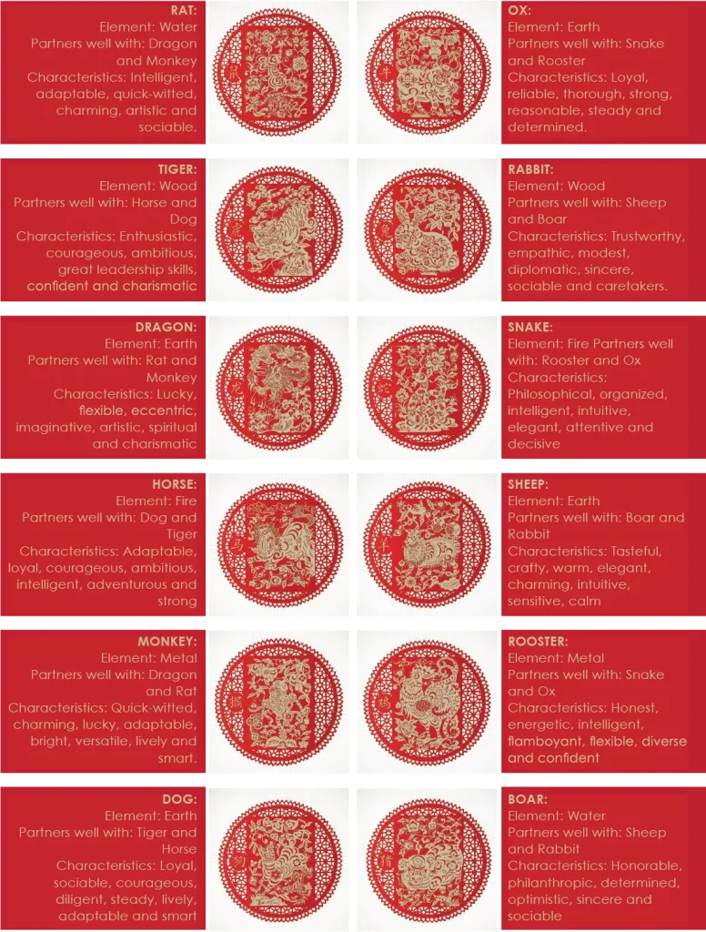 The Chinese Zodiac, known as Sheng Xiao, is based on a twelve-year cycle, each year in the cycle is related to an animal sign. These animal signs are the rat, ox, tiger, rabbit, dragon, snake, horse, sheep, monkey, rooster, dog and boar. It is calculated according to Chinese lunar calendar. The animal year, or the birth year, of a person is called his Benming Nian. The distinctive zodiacal way of calculating years based on the lunar calendar decides that once in every 12 years, every person will be reunited with his sign of birth.